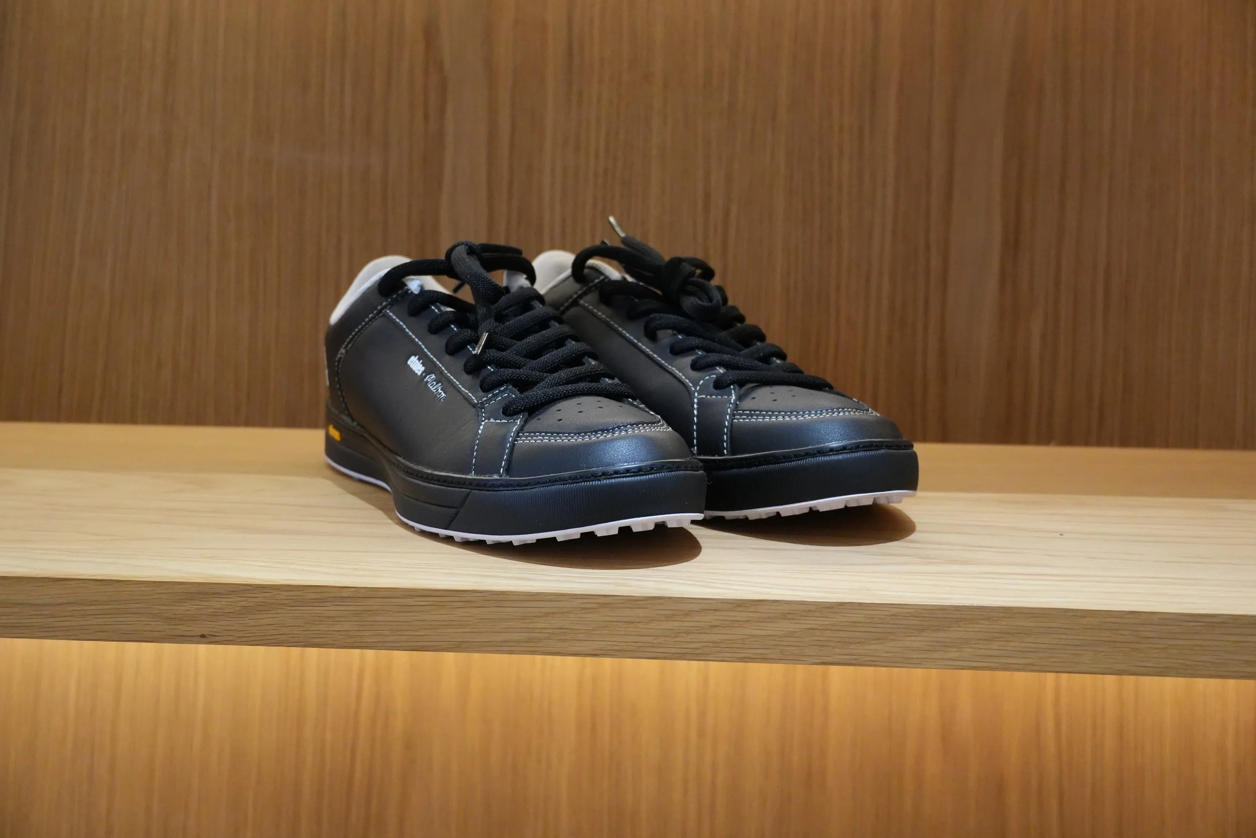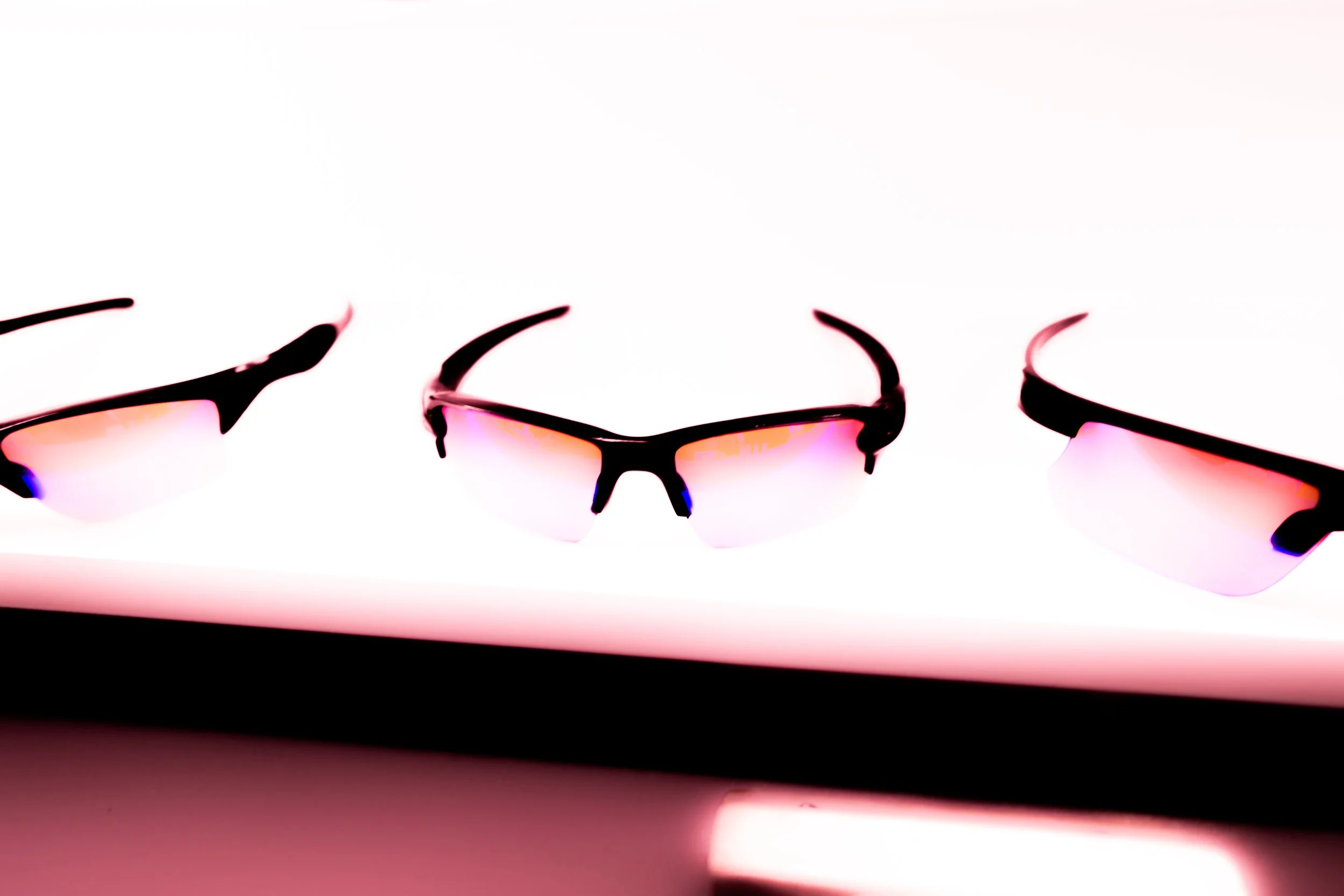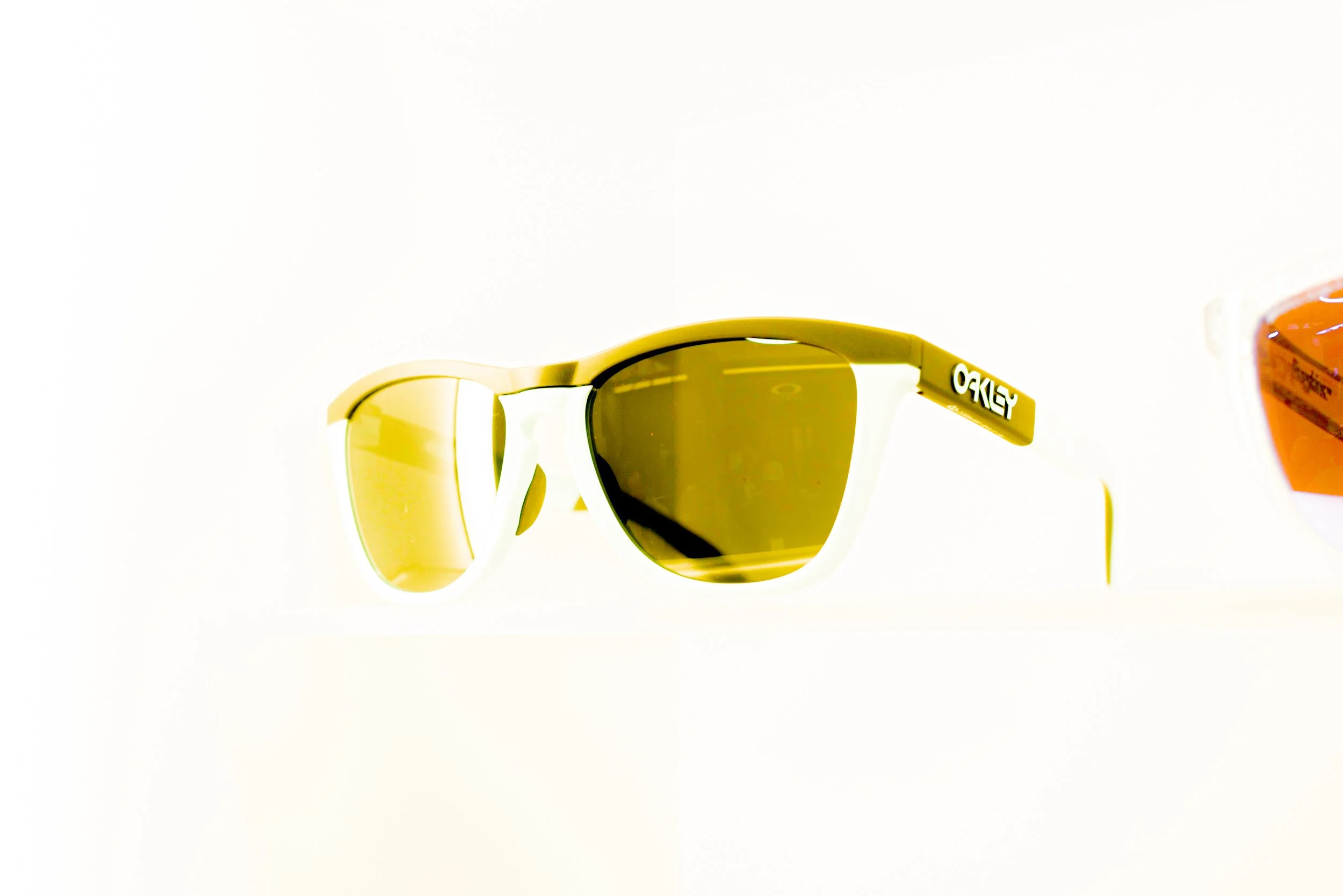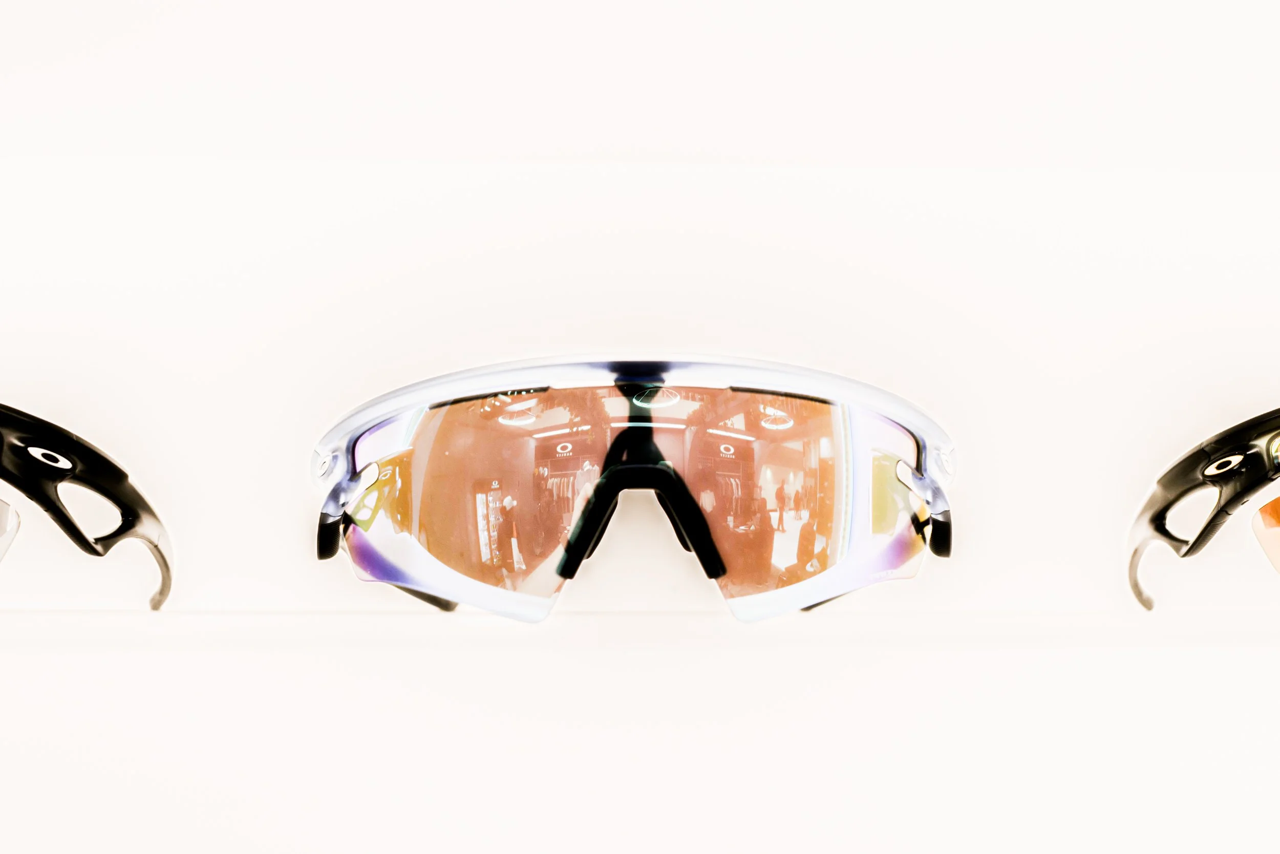 Black and white photo of an Oakley retail store with illuminated display walls and customers shopping inside.