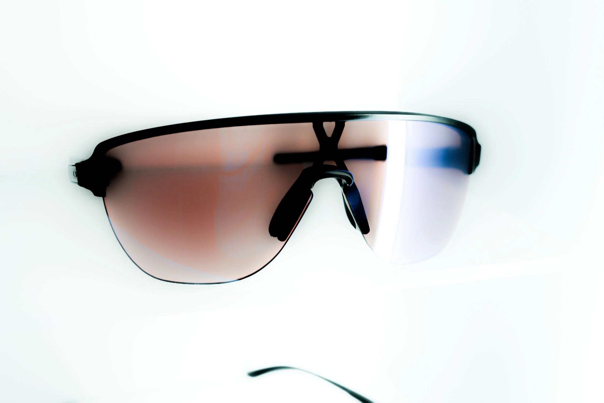 A pair of sports sunglasses with black frames and reflective orange-tinted lenses, displayed on a white background.